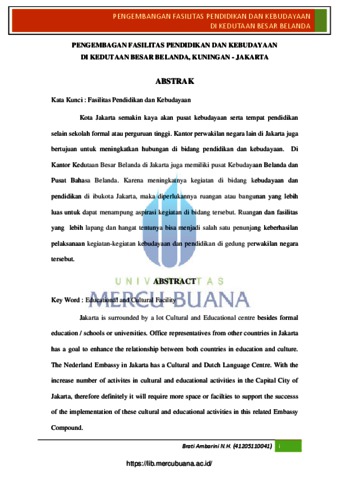 HANDONO, BRATI AMBARINI NOOR (2013) PENGEMBANGAN FASILITAS PENDIDIKAN DAN KEBUDAYAAN DI KEDUTAAN BESAR BELANDA, DI KUNINGAN - JAKARTA. S1 thesis, Universitas Mercu Buana Jakarta.