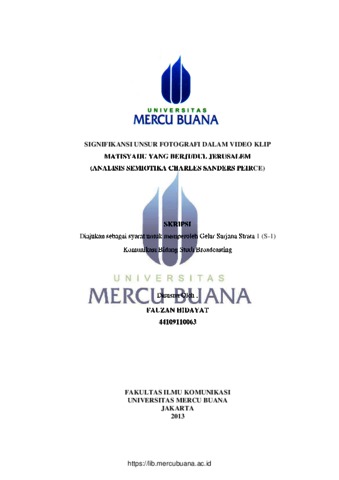 HIDAYAT, FAUZAN (2013) SIGNIFIKANSI KARYA FOTOGRAFI DALAM VIDEO KLIP MATISYAHU YANG BERJUDUL JERUSSALEM (ANALISIS SEMIOTIKA CHARLES SANDERS PEIRCE). S1 thesis, Universitas Mercu Buana.