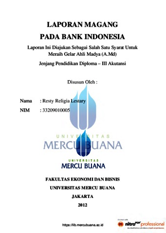 LESTARY, RESTY RELIGIA (2012) LAPORAN MAGANG PADA BANK INDONESIA. D3 thesis, Universitas Mercu Buana Jakarta.