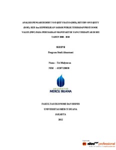 MULYAWAN, TRI (2012) ANALISIS PENGARUH DEBT TO EQUITY RATIO (DER), RETURN ON EQUITY (ROE), SIZE dan KEPEMILIKAN SAHAM PUBLIK TERHADAP PRICE BOOK VALUE (PBV) PADA PERUSAHAAN MANUFAKTUR YANG TERDAFTAR DI BEI TAHUN 2008 - 2010. S1 thesis, Universitas Mercu Buana Jakarta.
