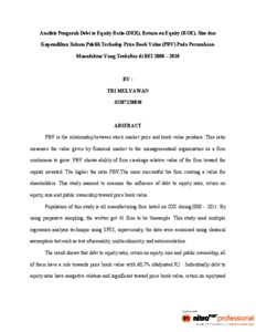 PBV is the relationship between stock market price and book value pershare. This ratio measures the value given by financial market to the managementand organization as a firm continuous to grow. PBV shows ability of firm creatinga relative value of the firm toward the capital invested. The higher the ratio PBV,The more successful the firm creating a value for shareholders. This study isaimed to examine the influence of debt to equity ratio, return on equity, size and public ownership toward price book value. Population of this study is all manufacturing firm listed on IDX during2008 - 2011. By using purposive sampling, the written got 41 firm to be thesample. This study used multiple regression analysis technique using SPSS, inpreviously, the data were examined using classical assumption test such as test ofnormality, multicolinierity, and autocorrelation. The result shows that debt to equity ratio, return on equity, size and public ownership, all of them have a role towards price book value with 60,7% ofadjusted R2 . Individually debt to equity ratio have anegative relation and significant toward price book value, return on equityand size have positive relation and significant toward price book value and public ownership haven’t relation toward price book value