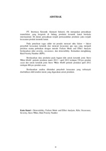 PT. Internusa Keramik Alamasri Industri, tbk merupakan perusahaan manufaktur yang bergerak di bidang produksi keramik lantai berskala internasional. Di dalam perusahaan terjadi permasalahan produksi yaitu terjadi kecacatan produk keramik lantai. Pada penulisan tugas akhir ini penulis mencari tahu faktor – faktor penyebab kecacatan keramik dan mencari kecacatan apa saja yang menjadi prioritas utama perbaikan dengan metode Failure Mode and Effect Analysis berdasarkan nilai severity, occurance, dan detectability. Kemudian menghitung Risk Priority Number (RPN). Berdasarkan data produksi pada bagian kiln untuk keramik jenis Snow White 60x60 periode produksi maret 2012 – april 2012 terdapat 530 pcs produk cacat dan untuk keramik jenis Snow White 40x40 periode produksi april 2012 terdapat 406 pcs produk cacat. Berdasarkan analisa diketahui penyebab kecacatan yang terbanyak disebabkan oleh kondisi mesin yang digunakan untuk produksi.