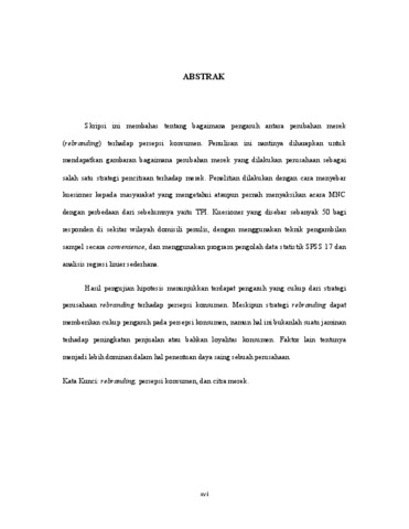 Skripsi ini membahas tentang bagaimana pengaruh antara perubahan merek (rebranding) terhadap persepsi konsumen. Penulisan ini nantinya diharapkan untuk mendapatkan gambaran bagaimana perubahan merek yang dilakukan perusahaan sebagai salah satu strategi pencitraan terhadap merek. Penelitian dilakukan dengan cara menyebar kuesioner kepada masyarakat yang mengetahui ataupun pernah menyaksikan acara MNC dengan perbedaan dari sebelumnya yaitu TPI. Kuesioner yang disebar sebanyak 50 bagi responden di sekitar wilayah domisili penulis, dengan menggunakan teknik pengambilan sampel secara convenience, dan menggunakan program pengolah data statistik SPSS 17 dan analisis regresi linier sederhana. Hasil pengujian hipotesis menunjukkan terdapat pengaruh yang cukup dari strategi perusahaan rebranding terhadap persepsi konsumen. Meskipun strategi rebranding dapat memberikan cukup pengaruh pada persepsi konsumen, namun hal ini bukanlah suatu jaminan terhadap peningkatan penjualan atau bahkan loyalitas konsumen. Faktor lain tentunya menjadi lebih dominan dalam hal penentuan daya saing sebuah perusahaan