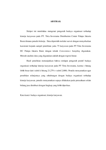 Skripsi ini membahas mengenai pengaruh budaya organisasi terhadap kinerja karyawan pada PT. Tirta Investama Distribution Center Palapa Jakarta Barat dimana penulis bekerja. Data diperoleh melalui survei dengan menyebarkan kuesioner kepada sampel penelitian yaitu 75 karyawan pada PT Tirta Investama DC Palapa Jakarta Barat dengan teknik Convenience Sampling digunakan. Metode analisis data yang digunakan adalah dengan regresi linear. Hasil penelitian menunjukkan bahwa terdapat pengaruh positif budaya organisasi terhadap kinerja karyawan pada PT Tirta Investama, karena t hitung lebih besar dari t tabel (t hitung 21,279 > t tabel 2,000). Penulis menyarankan agar penelitian selanjutnya yang sehubungan dengan budaya organisasi terhadap kinerja karyawan, penulis menyarankan supaya dilakukan pada perusahaan selain bidang jasa distribusi dengan lingkup yang lebih diperluas.