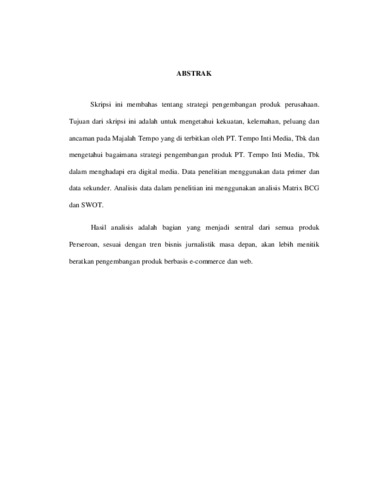 Skripsi ini membahas tentang strategi pengembangan produk perusahaan. Tujuan dari skripsi ini adalah untuk mengetahui kekuatan, kelemahan, peluang dan ancaman pada Majalah Tempo yang di terbitkan oleh PT. Tempo Inti Media, Tbk dan mengetahui bagaimana strategi pengembangan produk PT. Tempo Inti Media, Tbk dalam menghadapi era digital media. Data penelitian menggunakan data primer dan data sekunder. Analisis data dalam penelitian ini menggunakan analisis Matrix BCG dan SWOT. Hasil analisis adalah bagian yang menjadi sentral dari semua produk Perseroan, sesuai dengan tren bisnis jurnalistik masa depan, akan lebih menitik beratkan pengembangan produk berbasis e-commerce dan web.