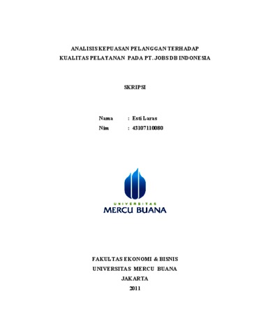LARAS, ESTI (2011) ANALISIS KEPUASAN PELANGGAN TERHADAP KUALITAS PELAYANAN PADA PT. JOBS DB INDONESIA. S1 thesis, Universitas Mercu Buana Jakarta.