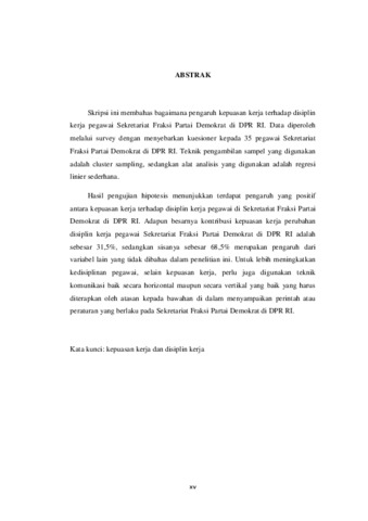 Skripsi ini membahas bagaimana pengaruh kepuasan kerja terhadap disiplin kerja pegawai Sekretariat Fraksi Partai Demokrat di DPR RI. Data diperoleh melalui survey dengan menyebarkan kuesioner kepada 35 pegawai Sekretariat Fraksi Partai Demokrat di DPR RI. Teknik pengambilan sampel yang digunakan adalah cluster sampling, sedangkan alat analisis yang digunakan adalah regresi linier sederhana. Hasil pengujian hipotesis menunjukkan terdapat pengaruh yang positif antara kepuasan kerja terhadap disiplin kerja pegawai di Sekretariat Fraksi Partai Demokrat di DPR RI. Adapun besarnya kontribusi kepuasan kerja perubahan disiplin kerja pegawai Sekretariat Fraksi Partai Demokrat di DPR RI adalah sebesar 31,5%, sedangkan sisanya sebesar 68,5% merupakan pengaruh dari variabel lain yang tidak dibahas dalam penelitian ini. Untuk lebih meningkatkan kedisiplinan pegawai, selain kepuasan kerja, perlu juga digunakan teknik komunikasi baik secara horizontal maupun secara vertikal yang baik yang harus diterapkan oleh atasan kepada bawahan di dalam menyampaikan perintah atau peraturan yang berlaku pada Sekretariat Fraksi Partai Demokrat di DPR RI.