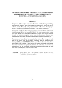 The purpose of this study is to examine the factors which affecting audit delay. Audit delay is length of time from company’s financial year end to the date of auditor’s report. This study using some variables, such as size of company’s, Income / Loss Report, Companies Profitability’s and auditor’s reputation. The research samples is taken from population of companies listing on Indonesia Stock Exchange (IDX) for period 2007-2009. The other resources data is also taken from, ICMD and Capital Market Reference Center. Data analysis methods of study are statistic descriptive, normal test with Kolmogorov Smirnov test, transformation data, classic assumption and multiple regression hypothesis test. The outcome of research can be summarized as follows. The average of audit delay on go public food and beverages companies listed in Indonesia Stock Exchange (IDX) period 2007-2009 is 73.68 days. The result of this study shows that variable of the company’s size, gain or loss report, profitability and variable of auditor’s reputation not significantly affecting the audit delay. Its show that the audits delay of the big four public accountant firm was not shorter than the audit delay done by non big four public accountant firm