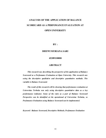 This research was describing the perspective of the application of Balance Scorecard as a Perfomance Evaluation at Open University. This research was using the descriptive qualitative and descriptive quantitative methode. The variable is Balance Scorecard. The result of this research will be showing that performance evaluation at Universitas Terbuka was only using descriptive quantitative data as a key performance indicator. Some of the ratio as a part of Balance Scorecard Perspective can be identified at the operational of Universitas Terbuka, so Perfomance Evaluation using Balance Scorecard can be implemented.