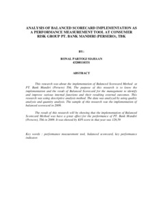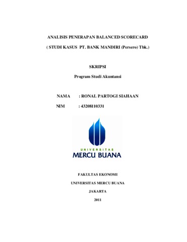SIAHAAN, RONAL PARTOGI (2011) ANALISIS PENERAPAN BALANCED SCORECARD (STUDI KASUS PT. BANK MANDIRI PERSERO TBK). S1 thesis, Universitas Mercu Buana Jakarta.