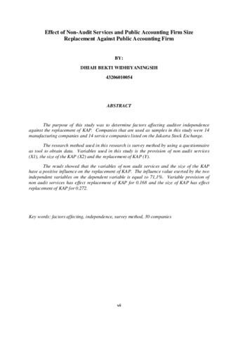 The purpose of this study was to determine factors affecting auditor independence against the replacement of KAP. Companies that are used as samples in this study were 14 manufacturing companies and 14 service companies listed on the Jakarta Stock Exchange. The research method used in this research is survey method by using a questionnaire as tool to obtain data. Variables used in this study is the provision of non audit services (X1), the size of the KAP (X2) and the replacement of KAP (Y). The result showed that the variables of non audit services and the size of the KAP have a positive influence on the replacement of KAP. The influence value exerted by the two independent variables on the dependent variable is equal to 71,1%. Variable provision of non audit services has effect replacement of KAP for 0.168 and the size of KAP has effect replacement of KAP for 0.272.