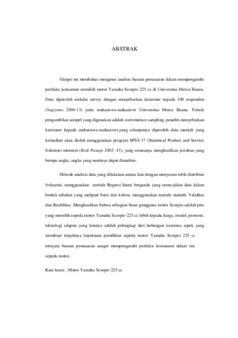 Skripsi ini membahas mengenai analisis bauran pemasaran dalam mempengaruhi perilaku konsumen memilih motor Yamaha Scorpio 225 cc di Universitas Mercu Buana. Data diperoleh melalui survey dengan menyebarkan kuisioner kepada 100 responden (Sugiyono 2006:15) yaitu mahasiswa-mahasiswi Universitas Mercu Buana. Teknik pengambilan sampel yang digunakan adalah convenience sampling, peneliti menyebarkan kuisioner kepada mahasiswa-mahasiswi,yang selanjutnya diperoleh data mentah yang kemudian akan diolah menggunakan program SPSS 17 (Statistical Product and Service Solution) menurut (Redi Panuju 2002: 45), yang semuanya menghasilkan jawaban yang berupa angka, angka yang nantinya dapat dianalisis. Metode analisis data yang dilakukan antara lain dengan menyusun table distribusi frekuensi, menggunakan metode Regresi linear berganda yang menyajikan data dalam bentuk tabulasi yang meliputi baris dan kolom, menggunakan metode statistik Validitas dan Reabilitas. Menghasilkan bahwa sebagian besar pengguna motor Scorpio adalah pria yang memilih sepeda motor Yamaha Scorpio 225 cc lebih kepada harga, model, promosi, teknologi adapun yang lainnya adalah pelengkap dari hubungan kesemua aspek yang membuat terjadinya keputusan pemilihan sepeda motor Yamaha Scorpio 225 cc dan ternyata bauran pemasaran sangat mempengaruhi perilaku konsumen dalam memilih sepeda motor.