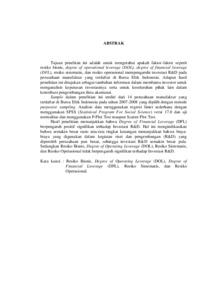 Tujuan penelitan ini adalah untuk mengetahui apakah faktor-faktor seperti resiko bisnis, degree of operational leverage (DOL), degree of financial leverage (DFL), resiko sistematis, dan resiko operasional mempengaruhi investasi R&D pada perusahaan manufaktur yang terdaftar di Bursa Efek Indonesia. Adapun hasil penelitian ini ditujukan sebagai tambahan informasi dalam membantu investor untuk menganalisis keputusan investasinya serta untuk keseluruhan pihak lain dalam kontribusi pengembangan ilmu akuntansi. Sample dalam penelitian ini terdiri dari 14 perusahaan manufaktur yang terdaftar di Bursa Efek Indonesia pada tahun 2007-2008 yang dipilih dengan metode purposive sampling. Analisis data menggunakan regresi linier sederhana dengan menggunakan SPSS (Statistical Program For Social Science) versi 17.0 dan uji normalitas dan menggunakan P-Plot Test maupun Scatter Plot Test. Hasil penelitian menunjukkan bahwa Degree of Financial Leverage (DFL) berpengaruh positif signifikan terhadap Investasi R&D. Hal ini mengindikasikan bahwa semakin besar rasio rata-rata tingkat keuangan menunjukkan bahwa biayabiaya yang digunakan dalam kegiatan riset dan pengembangan (R&D) yang diperoleh perusahaan pun besar, sehingga investasi R&D semakin besar pula. Sedangkan Resiko Bisnis, Degree of Operating Leverage (DOL), Resiko Sistematis, dan Resiko Operasional tidak berpengaruh signifikan terhadap Investasi R&D.