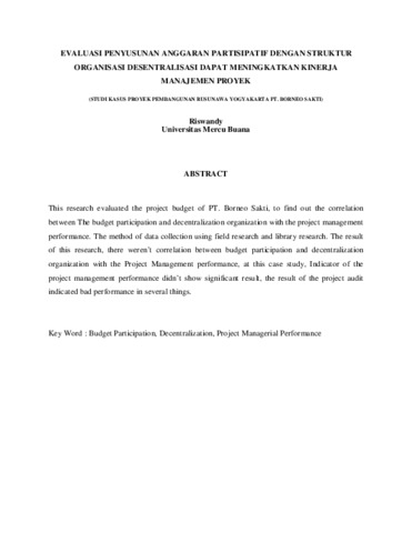 This research evaluated the project budget of PT. Borneo Sakti, to find out the correlation between The budget participation and decentralization organization with the project management performance. The method of data collection using field research and library research. The result of this research, there weren’t correlation between budget participation and decentralization organization with the Project Management performance, at this case study, Indicator of the project management performance didn’t show significant result, the result of the project audit indicated bad performance in several things.