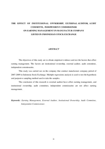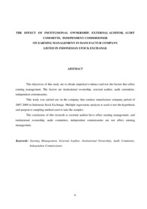 The objectives of this study are to obtain empirical evidence and test the factors that affect earning management. The factors are institutional ownership, external auditor, audit committee, independent commissaries. This study was carried out on the company that conduct manufacture company period of 2007-2009 in Indonesia Stock Exchange. Multiple regressions analysis is used to test the hypothesis and purposive sampling method used to take the samples. The conclusion of this research is external auditor have affect earning management, and institutional ownership, audit committee, independent commissaries are not affect earning management
