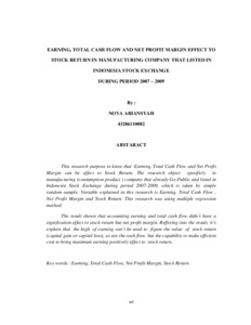 Penelitian in berujuan untuk mengetahu pengaruh Laba Akuntansi, Total Arus Kas dan Net Profit Margin terhaddap Return Saham. Objek penelitian secara spesifik dipilih adalah perusahaan yang bergerak dalam industri produk konsumsi yang telah Go-Publik dan terdaftar di Bursa Efek Indonesia berturut-turut selama tahun 2007-2009. Variabel yang digunakan dalam penelitian ini adalah laba akuntansi , total arus kas , net profit margin dan return saham. Penelitian menggunakan analisa regresi linier berganda. Hasil penelitian menunjukan bahwa laba akuntansi, total arus kas tidak memiliki pengaruh yang signifikan terhadap return saham sementara net profit margin memiliki pengaruh terhadap return saham. Berdasarkan hasil penelitian tersebut menjelaskan bahwa besarnya laba akuntansi dan total arus kas tidak dapat digunakan untuk menjelaskan besarnya return saham yang akan dihasilkan (capital gain atau capital lose). Melainkan kemampuan perusahaan dalam mengefisiensikan penggunaan sumber daya (biaya) untuk menghasilkan laba yang maksimal dapat mempengaruhi peningkatan atau penurunan stock return.