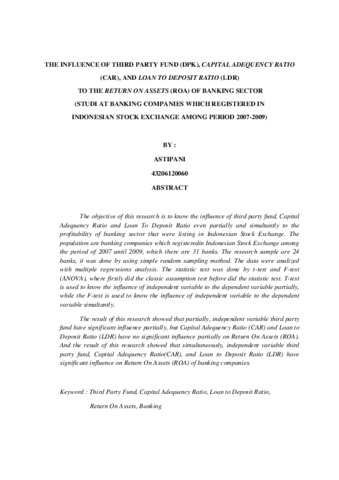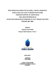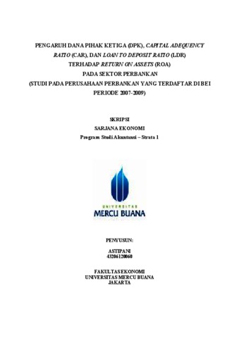 ASTIPANI, ASTIPANI (2011) PENGARUH DANA PIHAK KETIGA (DPK), CAPITAL ADEQUENCY RATIO (CAR), DAN LOAN TO DEPOSIT RATIO (LDR) TERHADAP RETURN ON ASSETS (ROA) PADA SEKTOR PERBANKAN (STUDI PADA PERUSAHAAN PERBANKAN YANG TERDAFTAR DI BEI PERIODE 2007-2009). S1 thesis, Universitas Mercu Buana Jakarta.