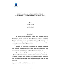Tujuan dari penelitian ini adalah untuk memeriksa kinerja keuangan perusahaan-perusahaan satu tahun sebelum dan satu tahun setelah right issue. Aspek-aspek penting dalam kinerja keuangan perusahaan adalah current ratio, quick ratio, leverage ratio, return on assets, return on equity, net profit margin, total assets turnover, earnings per share, price earnings ratio dan return Saham. Sampel dari penelitian ini adalah 42 perusahaan dengan right issue yang telah diumumkan di Bursa Efek Indonesia selama periode 2007-2009. Data dianalisis dengan menggunakan uji wilcoxon non-parametric. Hasil yang diperoleh menunjukkan bahwa terdapat selisih nilai antara nisbah utang dan rasio penghasilan harga sebelum dan setelah right issue. Sedangkan rasio aset lancar, rasio aset tunai, laba atas aset, laba atas modal sendiri, margin laba bersih, perputaran total aset, dan pendapatan per saham tidak memiliki selisih nilai sebelum dan setelah right issue