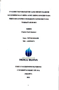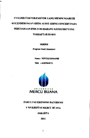 KURNIASIH, NOVI (2011) ANALISIS FAKTOR-FAKTOR YANG MEMPENGARUHI KECENDERUNGAN OPINI AUDIT GOING CONCERN PADA PERUSAHAAN INDUSTRI BARANG KONSUMSI YANG TERDAFTAR DI BEI. S1 thesis, Universitas Mercu Buana Jakarta.