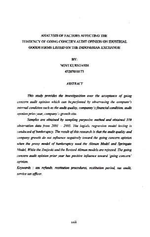 his study provides the investigasition over the acceptance of going concern audit opinion which can be,perfomed by observasing the company's internal condition such as the audit quality, companny's financial condition, audit opinion prios year, company's growth size. Samples are obtained by sampling purposive method and obtained 310 observation data from 2001 - 2005. The logistic regression model testing is conducted of bankeruptcy. The result of this research is that the audit quality and company growth do not influence negatively toward the going concern opinion when the proxy model of bankeruptcy used the Altman Model and Springate Model, Whlie the Zmijeski and the Revised Altman models are rejected. The going concern audit opinion prior year has positive influence toward 'going concern' opinion.