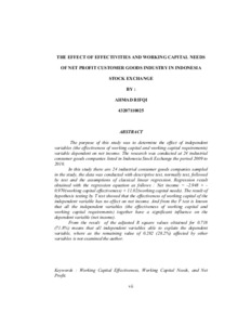 Tujuan dari penelitian ini adalah untuk mengetahui pengaruh variabel independen (efektivitas modal kerja dan kebutuhan modal keja ) terhadap variabel dependen laba bersih. Penelitian ini dilakukan pada 24 perusahaan barang industri konsumsi yang terdaftar di Bursa Efek Indonesia periode 2009 sampai 2010. Pada penelitian ini terdapat 24 perusahaan barang industri konsumsi yang dijadikan sampel pada penelitian, data-data tersebut dilakukan dengan pengujian deskriptif, uji normalitas, lalu dilanjutkan dengan uji asumsi klasik dan uji regresi linear. Hasil regresi diperoleh dengan persamaan regresi sebagai berikut : Laba bersih = -2.948 + -0.970(efektifitas modal kerja) + 11.028(kebutuhan modal kerja). Hasil uji hipotesis dengan uji T menunjukan bahwa variabel independen efektifitas modal kerja tidak memiliki pengaruh terhadap laba bersih sedangkan kebutuhan modal kerja memiliki pengaruh terhadap laba bersih. Dan dari hasil uji F diketahui bahwa seluruh variabel independen (efektifitas modal kerja dan kebutuhan modal kerja) terhadap secara bersama-sama memiliki pengaruh secara signifikan terhadap variabel dependen (laba bersih). Dari hasil adjusted R Square diperoleh nilai sebesar 0.718 (71.8%) artinya seluruh varibel independen mampu menjelaskan variabel dependen,sedangkan nilai sisanya yang sebesa