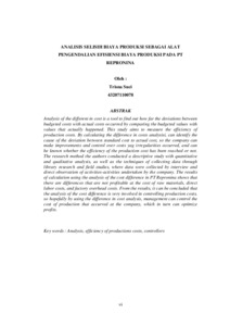 Analysis of the different in cost is a tool to find out how far the deviations between budgeted costs with actual costs occurred by comparing the budgeted values with values that actually happened. This study aims to measure the efficiency of production costs. By calculating the difference in costs analysisi, can identify the cause of the deviation between standard cost to actual cost, so the company can make improvements and control over costs yag irregularities occurred, and can be known whether the efficiency of the production cost has been reached or not. The research method the authors conducted a descriptive study with quantitative and qualitative analysis, as well as the techniques of collecting data through library research and field studies, where data were collected by interview and direct observation of activities-activities undertaken by the company. The results of calculation using the analysis of the cost difference in PT Repronina shows that there are differences that are not profitable at the cost of raw materials, direct labor costs, and factory overhead costs. From the results, it can be concluded that the analysis of the cost difference is very involved in controlling production costs, so hopefully by using the difference in cost analysis, management can control the cost of production that accurred at the company, which in turn can optimize profits.