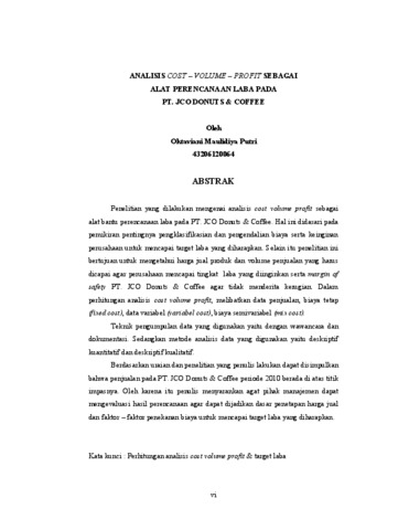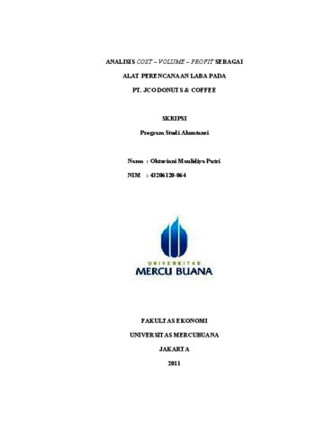 PUTRI, OKTAVIANI MAULIDIYA (2011) ANALISIS COST – VOLUME – PROFIT SEBAGAI ALAT PERENCANAAN LABA PADA PT. JCO DONUTS & COFFEE. S1 thesis, Universitas Mercu Buana Jakarta.