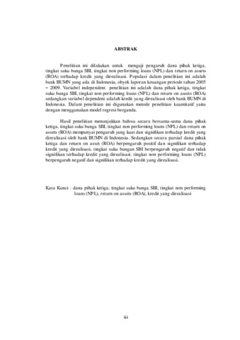 Penelitian ini dilakukan untuk menguji pengaruh dana pihak ketiga, tingkat suku bunga SBI, tingkat non performing loans (NPL) dan return on assets (ROA) terhadap kredit yang direalisasi. Populasi dalam penelitian ini adalah bank BUMN yang ada di Indonesia, obyek laporan keuangan periode tahun 2005 – 2009. Variabel independent penelitian ini adalah dana pihak ketiga, tingkat suku bunga SBI, tingkat non performing loans (NPL) dan return on assets (ROA) sedangkan variabel dependent adalah kredit yang direalisasi oleh bank BUMN di Indonesia. Dalam penelitian ini digunakan metode penelitian kuantitatif yaitu dengan menggunakan model regresi berganda. Hasil penelitian menunjukkan bahwa secara bersama-sama dana pihak ketiga, tingkat suku bunga SBI, tingkat non performing loans (NPL) dan return on assets (ROA) mempunyai pengaruh yang kuat dan signifikan terhadap kredit yang direalisasi oleh bank BUMN di Indonesia. Sedangkan secara parsial dana pihak ketiga dan return on asset (ROA) berpengaruh positif dan signifikan terhadap kredit yang direalisasi, tingkat suku bungan SBI berpengaruh negatif dan tidak signifikan terhadap kredit yang direalisasi. tingkat non performing loans (NPL) berpengaruh negatif dan signifikan terhadap kredit yang direalisasi.