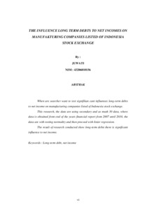 When are searcher want to test signifikan cant influenses long-term debts to net income on manufacturing companies listed of Indonesia stock exchange. This research, the data are using secondary and as mush 30 data, where data is obtained from end of the years financial report from 2007 until 2010, the data are with testing normality and then proceed with linier regression. The result of research conducted show long-term debts there is significant influence to net income