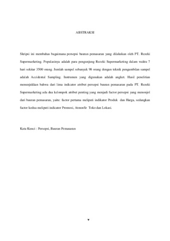 Skripsi ini membahas bagaimana persepsi bauran pemasaran yang dilakukan oleh PT. Rezeki Supermarketing. Populasinya adalah para pengunjung Rezeki Supermarketing dalam waktu 7 hari sekitar 3500 orang. Jumlah sampel sebanyak 98 orang dengan teknik pengambilan sampel adalah Accidental Sampling. Instrumen yang digunakan adalah angket. Hasil penelitian menunjukkan bahwa dari lima indicator atribut persepsi bauran pemasaran pada PT. Rezeki Supermarketing ada dua kelompok atribut penting yang menjadi factor persepsi yang menonjol dari bauran pemasaran, yaitu: factor pertama meliputi indikator Produk dan Harga, sedangkan factor kedua meliputi indicator Promosi, Atmosfir Toko dan Lokasi.