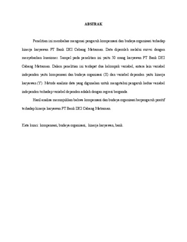 Penelitian ini membahas mengenai pengaruh kompensasi dan budaya organisasi terhadap kinerja karyawan PT Bank DKI Cabang Matraman. Data diperoleh melalui survei dengan menyebarkan kuesioner. Sampel pada penelitian ini yaitu 50 orang karyawan PT Bank DKI Cabang Matraman. Dalam penelitian ini terdapat dua kelompok variabel, antara lain variabel independen yaitu kompensasi dan budaya organisasi (X) dan variabel dependen yaitu kinerja karyawan (Y). Metode analisis data yang digunakan untuk mengetahui pengaruh kedua variabel independen terhadap variabel dependen adalah dengan regresi berganda. Hasil analisa menunjukkan bahwa kompensasi dan budaya organisasi berpengaruh positif terhadap kinerja karyawan PT Bank DKI Cabang Matraman
