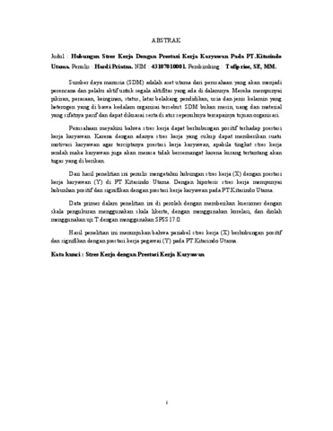 Sumber daya manusia (SDM) adalah aset utama dari perusahaan yang akan menjadi perencana dan pelaku aktif untuk segala aktifitas yang ada di dalamnya. Mereka mempunyai pikiran, perasaan, keinginan, status, latar belakang pendidikan, usia dan jenis kelamin yang heterogen yang di bawa kedalam organisai tersebut. SDM bukan mesin, uang dan material yang sifatnya pasif dan dapat dikuasai serta di atur sepenuhnya tercapainya tujuan organisasi. Perusahaan meyakini bahwa stres kerja dapat berhubungan positif terhadap prestasi kerja karyawan. Karena dengan adanya stres kerja yang cukup dapat memberikan suatu motivasi karyawan agar terciptanya prestasi kerja karyawan, apabila tingkat stres kerja rendah maka karyawan juga akan merasa tidak bersemangat karena kurang tertantang akan tugas yang di berikan. Dari hasil penelitian ini penulis mengetahui hubungan stres kerja (X) dengan prestasi kerja karyawan (Y) di PT Kitasindo Utama. Dengan hipotesis stres kerja mempunyai hubunhan positif dan signifikan dengan prestasi kerja karyawan pada PT.Kitasindo Utama. Data primer dalam penelitian ini di peroleh dengan memberikan kuesioner dengan skala pengukuran menggunakan skala likerte, dengan menggunakan korelasi, dan diolah menggunakan uji T dengan menggunakan SPSS17.0. Hasil penelitian ini menunjukan bahwa pariabel stres kerja (X) berhubungan positif dan signifikan dengan prestasi kerja pegawai (Y) pada PT.Kitasindo Utama