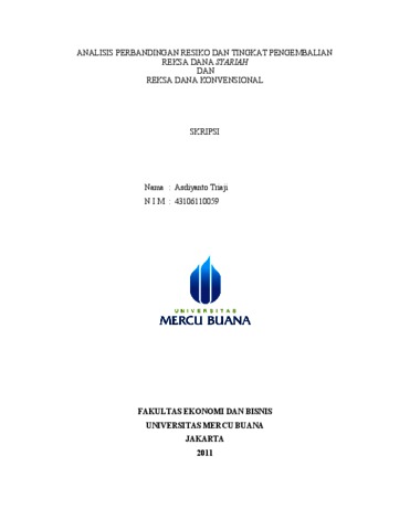 TRIAJI, ASDIYANTO (2011) ANALISIS PERBANDINGAN RESIKO DAN TINGKAT PENGEMBALIAN REKSA DANA SYARIAH DAN REKSA DANA KONVENSIONAL. S1 thesis, Universitas Mercu Buana Jakarta.