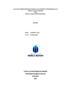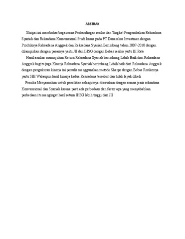 Skripsi ini membahas bagaimana Perbandingan resiko dan Tingkat Pengembalian Reksadana Syariah dan Reksadana Konvensional Studi kasus pada PT Danareksa Investmen dengan Produknya Reksadana Anggrek dan Reksadana Syariah Berimbang tahun 2007-2010 dengan dilampirkan dengan pasarnya yaitu JII dan IHSG dengan Bebas resiko yaitu BI Rate Hasil analisa menunjukan Return Reksadana Syariah berimbang Lebih Baik dari Reksadana Anggrek begitu juga Kinerja Reksadana Syariah berimbang Lebih baik dari Reksadana Anggrek dengan pengukuran kinerja ini penulis menggunakan metode Sharpe dengan Bebas Resikonya yaitu SBI Walaupun hasil kinerja kedua Reksadana tersebut dan tidak layak dibeli Penulis Menyarankan untuk penelitian selanjutnya diteruskan dengan semua jenis reksadana Konvensional dan Syariah karena pasti ada perbedaan dan factor apa yang menyebabkan perbedaan itu mengingat hasil return IHSG lebih tinggi dari JII