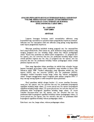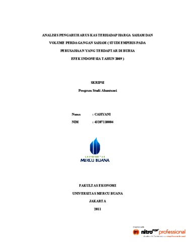 SYARIFUDIN, MUHAMMAD BAYU (2011) ANALISIS PENGARUH ARUS KAS TERHADAP HARGA SAHAM DAN VOLUME PERDAGANGAN SAHAM (STUDI EMPIRIS PADA PERUSAHAAN YANG TERDAFTAR DI BURSA EFEK INDONESIA TAHUN 2009). S1 thesis, Universitas Mercu Buana Jakarta.