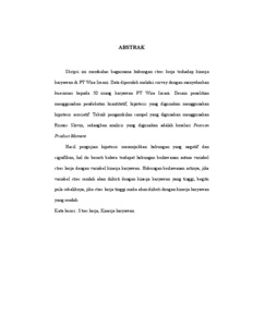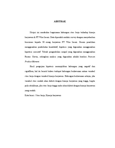 kripsi ini membahas bagaimana hubungan stres kerja terhadap kinerja karyawan di PT Wira Insani. Data diperoleh melalui survey dengan menyebarkan kuesioner kepada 50 orang karyawan PT Wira Insani. Desain penelitian menggunakan pendekatan kuantitatif, hipotesis yang digunakan menggunakan hipotesis asosiatif. Teknik pengambilan sampel yang digunakan menggunakan Rumus Slovin, sedangkan analisis yang digunakan adalah korelasi Pearson Product Moment. Hasil pengujian hipotesis menunjukkan hubungan yang negatif dan signifikan, hal itu berarti bahwa terdapat hubungan berlawanan antara variabel stres kerja dengan variabel kinerja karyawan. Hubungan berlawanan artinya, jika variabel stres rendah akan diikuti dengan kinerja karyawan yang tinggi, begitu pula sebaliknya, jika stres kerja tinggi maka akan diikuti dengan kinerja karyawan yang rendah