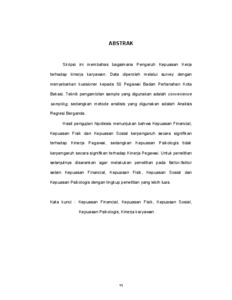 Skripsi ini membahas bagaimana Pengaruh Kepuasan Kerja terhadap kinerja karyawan. Data diperoleh melalui survey dengan menyebarkan kuesioner kepada 50 Pegawai Badan Pertanahan Kota Bekasi. Teknik pengambilan sample yang digunakan adalah convenience sampling, sedangkan metode analisis yang digunakan adalah Analisis Regresi Berganda. Hasil pengujian hipotesis menunjukan bahwa Kepuasan Financial, Kepuasan Fisik dan Kepuasan Sosial berpengaruh secara signifikan terhadap Kinerja Pegawai, sedangkan Kepuasan Psikologis tidak berpengaruh secara signifikan terhadap Kinerja Pegawai. Untuk penelitian selanjutnya disarankan agar melakukan penelitian pada faktor-faktor selain Kepuasan Financial, Kepuasan Fisik, Kepuasan Sosial dan Kepuasan Psikologis dengan lingkup penelitian yang lebih luas.