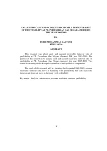 This research was about cash and account receivable turnover rate of profitability at PT. Perusahaan Gas Negara (Persero) Tbk year 2005-2009. The purpose of this research is to analyze cash and account receivable turnover rate of profitability at PT. Perusahaan Gas Negara (persero) tbk year 2005-2009. This research was using of the descriptive quantitative and qualitative comparative. The result of this research will be showing that for period 2005-2009, account receivable turnover rate move in harmony with profitability but cash receivable turnover rate does not move in harmony with profitability