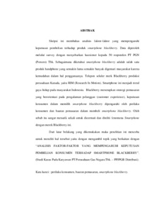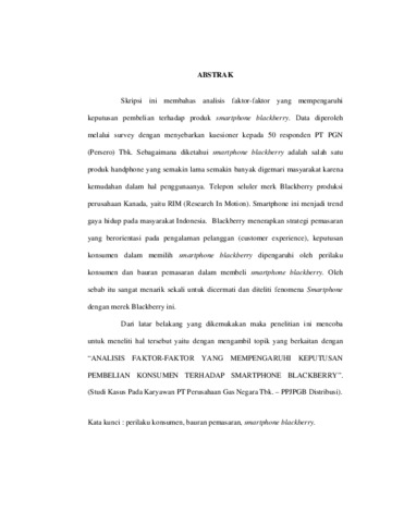Skripsi ini membahas analisis faktor-faktor yang mempengaruhi keputusan pembelian terhadap produk smartphone blackberry. Data diperoleh melalui survey dengan menyebarkan kuesioner kepada 50 responden PT PGN (Persero) Tbk. Sebagaimana diketahui smartphone blackberry adalah salah satu produk handphone yang semakin lama semakin banyak digemari masyarakat karena kemudahan dalam hal penggunaanya. Telepon seluler merk Blackberry produksi perusahaan Kanada, yaitu RIM (Research In Motion). Smartphone ini menjadi trend gaya hidup pada masyarakat Indonesia. Blackberry menerapkan strategi pemasaran yang berorientasi pada pengalaman pelanggan (customer experience), keputusan konsumen dalam memilih smartphone blackberry dipengaruhi oleh perilaku konsumen dan bauran pemasaran dalam membeli smartphone blackberry. Oleh sebab itu sangat menarik sekali untuk dicermati dan diteliti fenomena Smartphone dengan merek Blackberry ini. Dari latar belakang yang dikemukakan maka penelitian ini mencoba untuk meneliti hal tersebut yaitu dengan mengambil topik yang berkaitan dengan “ANALISIS FAKTOR-FAKTOR YANG MEMPENGARUHI KEPUTUSAN PEMBELIAN KONSUMEN TERHADAP SMARTPHONE BLACKBERRY”. (Studi Kasus Pada Karyawan PT Perusahaan Gas Negara Tbk. – PPJPGB Distribusi).