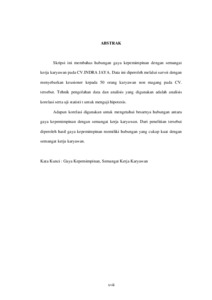 Skripsi ini membahas hubungan gaya kepemimpinan dengan semangat kerja karyawan pada CV.INDRA JAYA. Data ini diperoleh melalui survei dengan menyebarkan keusioner kepada 50 orang karyawan non magang pada CV. tersebut. Tehnik pengolahan data dan analisis yang digunakan adalah analisis korelasi serta uji statisti t untuk menguji hipotesis. Adapun korelasi digunakan untuk mengetahui besarnya hubungan antara gaya kepemimpinan dengan semangat kerja karyawan. Dari penelitian tersebut diperoleh hasil gaya kepemimpinan memiliki hubungan yang cukup kuat dengan semangat kerja karyawan.