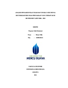 NELLY, RISMA (2011) ANALISIS PENGARUH NILAI TUKAR DAN TINGKAT SUKU BUNGA SBI TERHADAP IHSG PADA PERUSAHAAN YANG TERDAFTAR DI BEI PERIODE TAHUN 2006 – 2010. S1 thesis, Universitas Mercu Buana Jakarta.