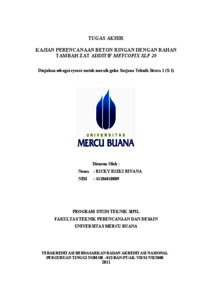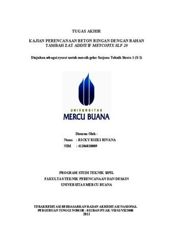RIVANA, RICKY RIZKI (2011) KAJIAN PERENCANAAN BETON RINGAN DENGAN BAHAN TAMBAH ZAT ADDITIF MEYCOFIX SLF 20. S1 thesis, Universitas Mercu Buana Jakarta.