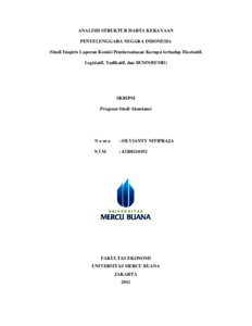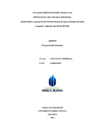 NITIPRAJA, SILVIANTY (2011) ANALISIS STRUKTUR HARTA KEKAYAAN PENYELENGGARA NEGARA INDONESIA (Studi Empiris Laporan Komisi Pemberantasan Korupsi terhadap Eksekutif, Legislatif, Yudikatif, dan BUMN/BUMD). S1 thesis, Universitas Mercu Buana Jakarta.
