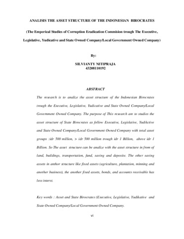 The research is to analize the asset structure of the Indonesian Birocrates trough the Executive, Legislative, Yudicative and State Owned Company/Local Government Owned Company. The purpose of This research are to studies the asset structure of State Birocrates as follow Executive, Legislative, Yudikctive and State Owned Company/Local Government Owned Company with total asset groups :idr 500 million, > idr 500 million trough idr 1 Billion, above idr 1 Billion. So The asset structure can be analize with the asset structure in from of land, buildings, transportation, fund, saving and deposite. The other saving assets in anthor structure like fixed assets (agriculture, plantation, minning and another business), the another fixed assets, bonds, and accounts receivable has less inters