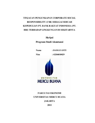 DAMAYANTI, DAMAYANTI (2011) TINJAUAN PENGUNKAPAN CORPORATE SOCIAL RESPONSIBILITY (CSR) SEBAGAI SEBUAH KEPEDULIAN PT. BANK RAKYAT INDONESIA (PT. BRI) TERHADAP LINGKUNGAN DI SEKITARNYA. S1 thesis, Universitas Mercu Buana Jakarta.