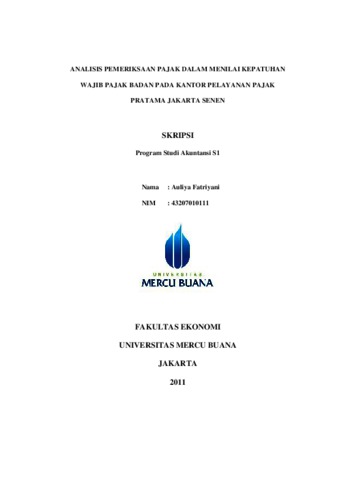 FATRIYANI, AULIYA (2011) ANALISIS PEMERIKSAAN PAJAK DALAM MENILAI KEPATUHAN WAJIB PAJAK BADAN PADA KANTOR PELAYANAN PAJAK PRATAMA JAKARTA SENEN. S1 thesis, Universitas Mercu Buana Jakarta.