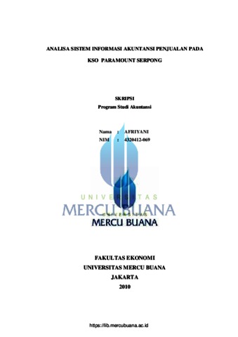 Apriyani, Apriyani (2011) ANALISA SISTEM INFORMASI AKUNTANSI PENJUALAN PADA KSO PARAMOUT SERPONG. S1 thesis, Universitas Mercu Buana.