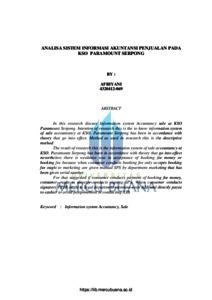 In this research discuss Information system Accuntancy sale at KSO Paramount Serpong. Intention of research this is the to know information system of sale accountancy at KSO. Paramount Serpong has been in accordance with theory that go into effect. Method as used in research this is the descriptive method. The result of research this is the information system of sale accountancy at KSO. Paramount Serpong has been in accordance with theory that go into effect nevertheless there is weakness was in acceptance of booking fee money or booking fee because when consumer conducts booking fee only accepts booking fee ought to marketing are given manual SPS by department marketing that has been given serial number. For that suggested if consumer conducts payment of booking fee money, consumer ought to directly conducts signing SPS. When consumer conducts signatory PPJB ought to legal department mentions costs AJB and directly payee to cashier to avoid postponement in conducting AJB. Keyword : Information system Accuntancy, Sale