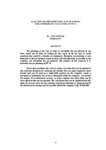 Tax planning is one way in order to streamline the tax allowed by tax laws, which can be done by looking for the cracks of the tax laws to avoid sanctions that could be a burden on companies. Therefore, tax planning is very important to discuss because it must be done well and efficiently as possible so the company can streamline the tax payment. The purpose of this research is to determine the tax planning at PT. X. Given these problems the writer to make a tax plan that can be applied in the corporate donations by replacing the benefits that can make employees more income and can be used as a deductable expense for the company, create a document or nominative list of every transaction made the company , cut Income Tax Article 23 on third-party services, so if the company uses these plans can be more efficient then the tax payable. The conclusion that can be obtained from this study are not yet carry out the company of good tax planning is characterized by the amount of tax savings may be possible should the company is Rp 78.046.800.
