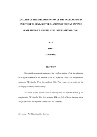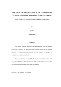 This Article examined analysis of the emplementation of the tax planning in an effort to minimize the payment of the tax expenses. Data Used are financial statement PT. Akasha Wira International, Tbk. This research was using of the deskriptif kuantitatif and kualitatif. The result of this research will be showing that the implementation of the tax planning PT. Akasha Wira International, Tbk. not fully efficient. because there are potential tax savings that can be done the company
